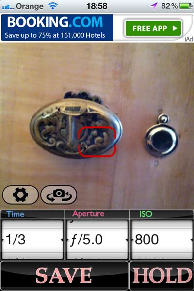 This is what the app looks like focused rather shakily on a door knob. You can see that the light is low because it recommends a shutter speed of 1/3 second at ISO 800 and an aperture of f5.0. I could have spun any of the dials to get the corresponding result.
