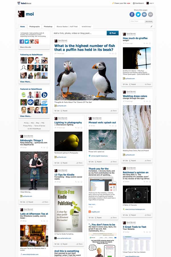 Have you tried Rebel Mouse? I am not sure where it is going with its service (oh, yes – they introduced a ‘pro’ service recently) – but whatever may or may not happen with the service, it is pleasant to see all my posts gathered in from here and there.