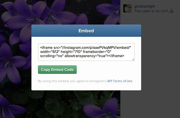 Now, when you visit an Instagram photo or video page on your desktop web browser, you’ll see a new share button on the right side of your photo (just under the comments button). Click the button to see the embed code. Copy the block of text it gives you and paste it into your blog, website or article. When you hit publish, the photo or video will appear.