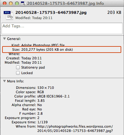There are two problems with the iOS app as far as I can see. One is the size of the uploaded image, which is 205kB. The other is minor, but it’s the strange and meaningless name of the image, which is 20140528-175753-64673987.jpg