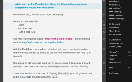 With the Markdown markup I can style text with just a couple of asterisks and underlines instead of having to use the html markup with ’em’ and ‘b’ in brackets.