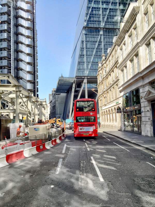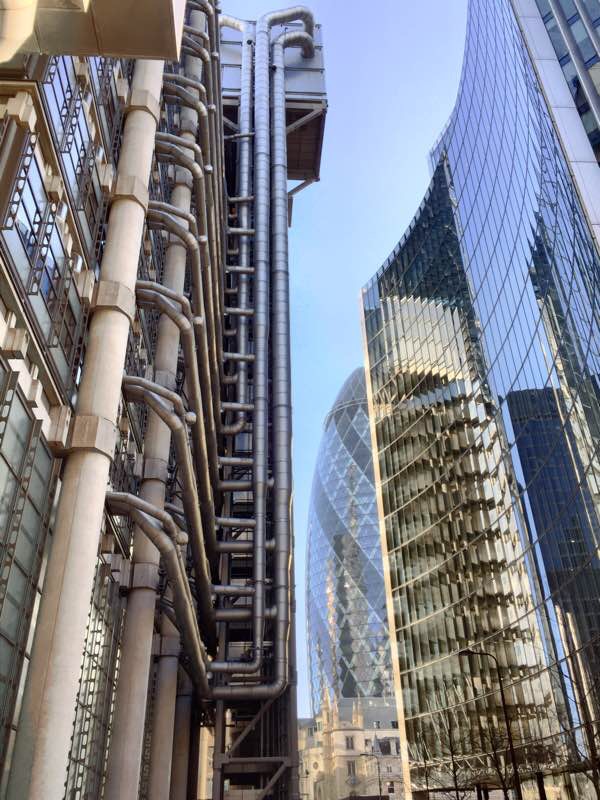 And here is a view of the side of the Lloyds Building (the building on the left) showing its ‘inside out’ design with all the pipe-work on the outside.