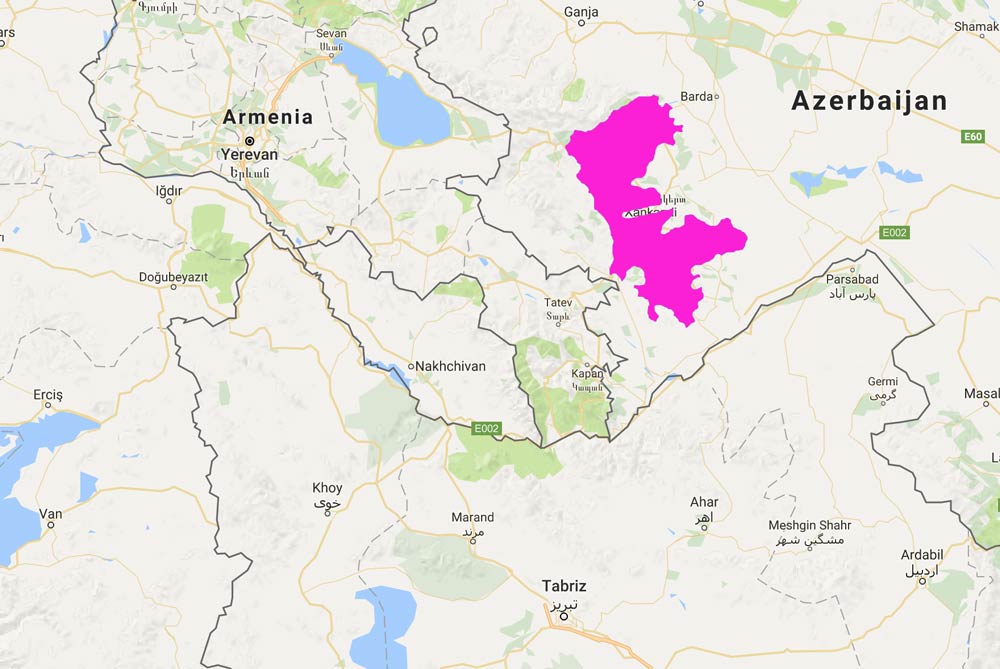 It is internationally recognised as being part of Azerbaijan but is run as an independent state by the Armenian ethnic majority. Not being a country, it isn’t marked on most maps and I have coloured it fuchsia on this Google map.
