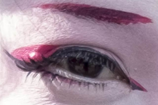 Now, here next is a crop of less than half a percent of the area of the full frame. You can recognise the eye, but you can see that the image is starting to break up. You can begin to see the digital bits and shapes that make up the image.