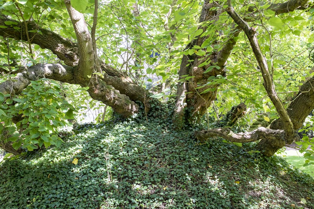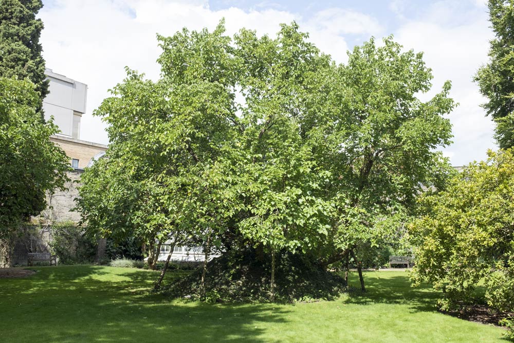 Walk directly across the grass or follow the path either way around to the far end. There, there are two mulberry trees, the older of which was planted in 1608 and both of which still fruit every year.