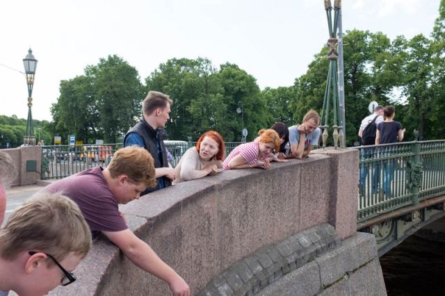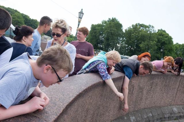 In the first photo you can see Chizhik-Pyzhik, a tiny statue of a bird on a pedestal built into the stonework of the riverside near the Pantelejmonov bridge that crosses the River Fontanki in Saint Petersburg.