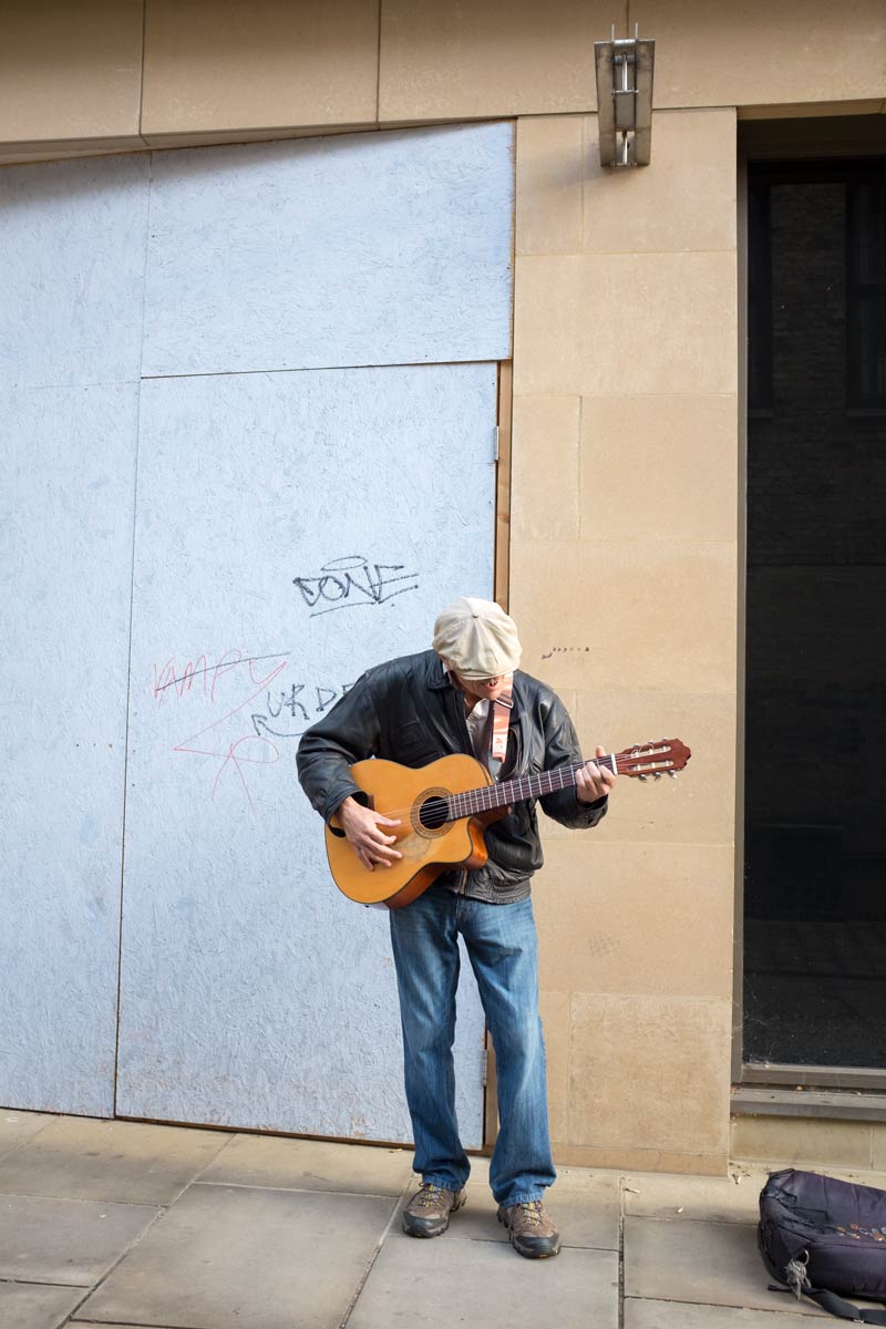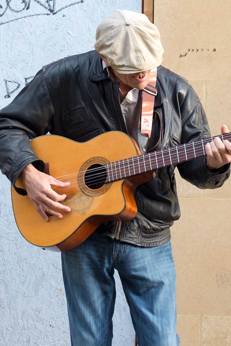 I am not sure what songs he sings – it’s muffled because he sings with his head down, and my hearing is not that acute. Maybe something from Leonard Cohen or Bob Dylan. He’s not young, very tanned face. Keeps his clothes neat.