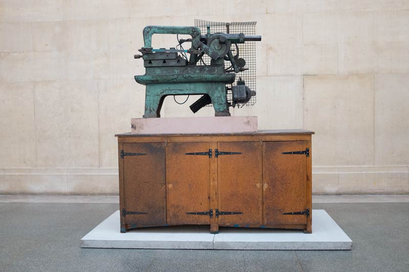 The machine is sitting on top of a slab of cut stone. The stone is very fine grained. Maybe it is Portland stone. I say that because cement is made from the pale grey stone quarried in Portland in Dorset.
