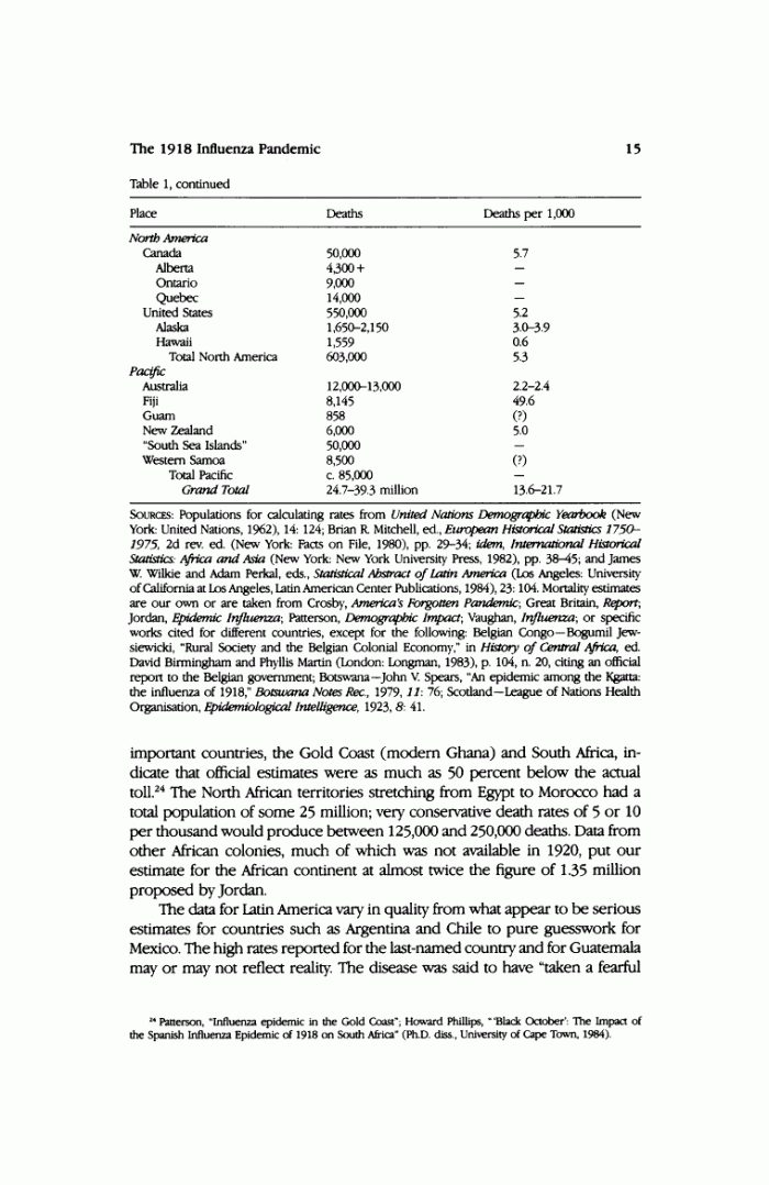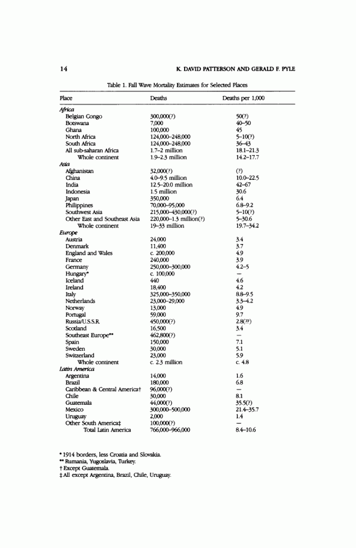 Estimates of total influenza mortality and cause-specific mortality rates are summarized in table 1. Question marks indicate especially unreliable numbers. Rates are calculated on the basis of population figures from census returns, estimates in standard reference works, or United Nations estimates. Populations are generally reported for 1920, not 1918, but this source of error is certainly smaller than others.