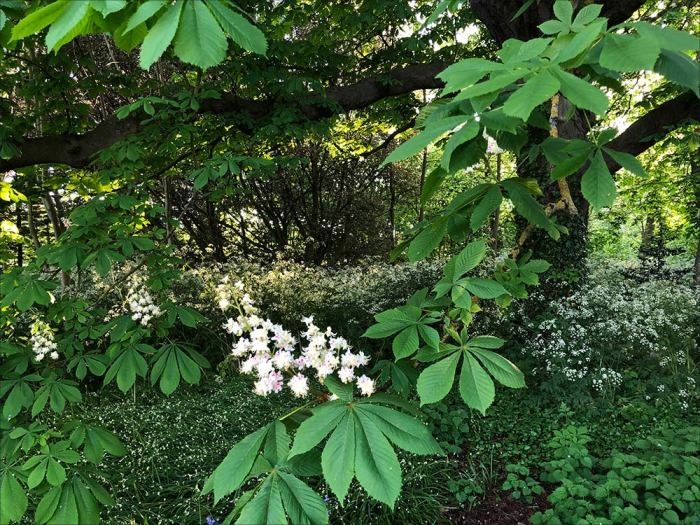 This scene however, is looking through the fence by the road. Can you see the bluebells just within the frame at the bottom? And a horse chestnut tree dominating the scene.