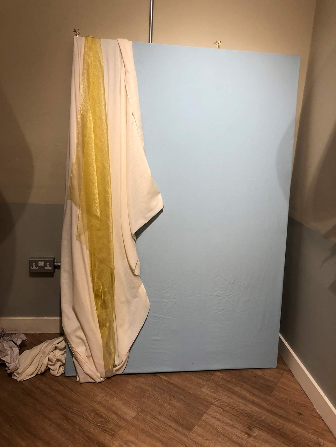Then here below is the original iPhone photo. And as you can see it is just a sheet hanging over a blue board.