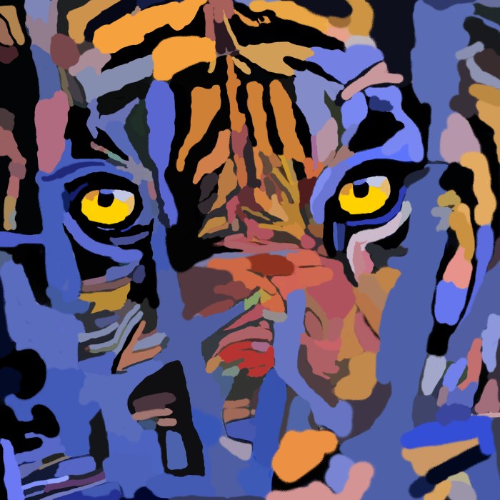 Then I duplicated the layer in Photoshop and painted over the image. The tiger’s right eye was partially obscured in the original so I duplicated the tiger’s left eye and reversed it to make it’s right eye and then rotated it slightly before blending it in.