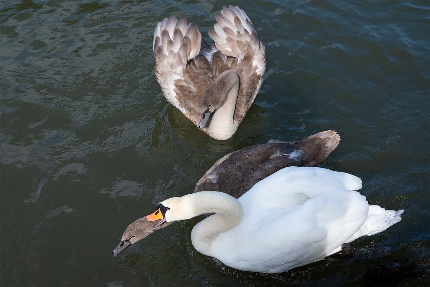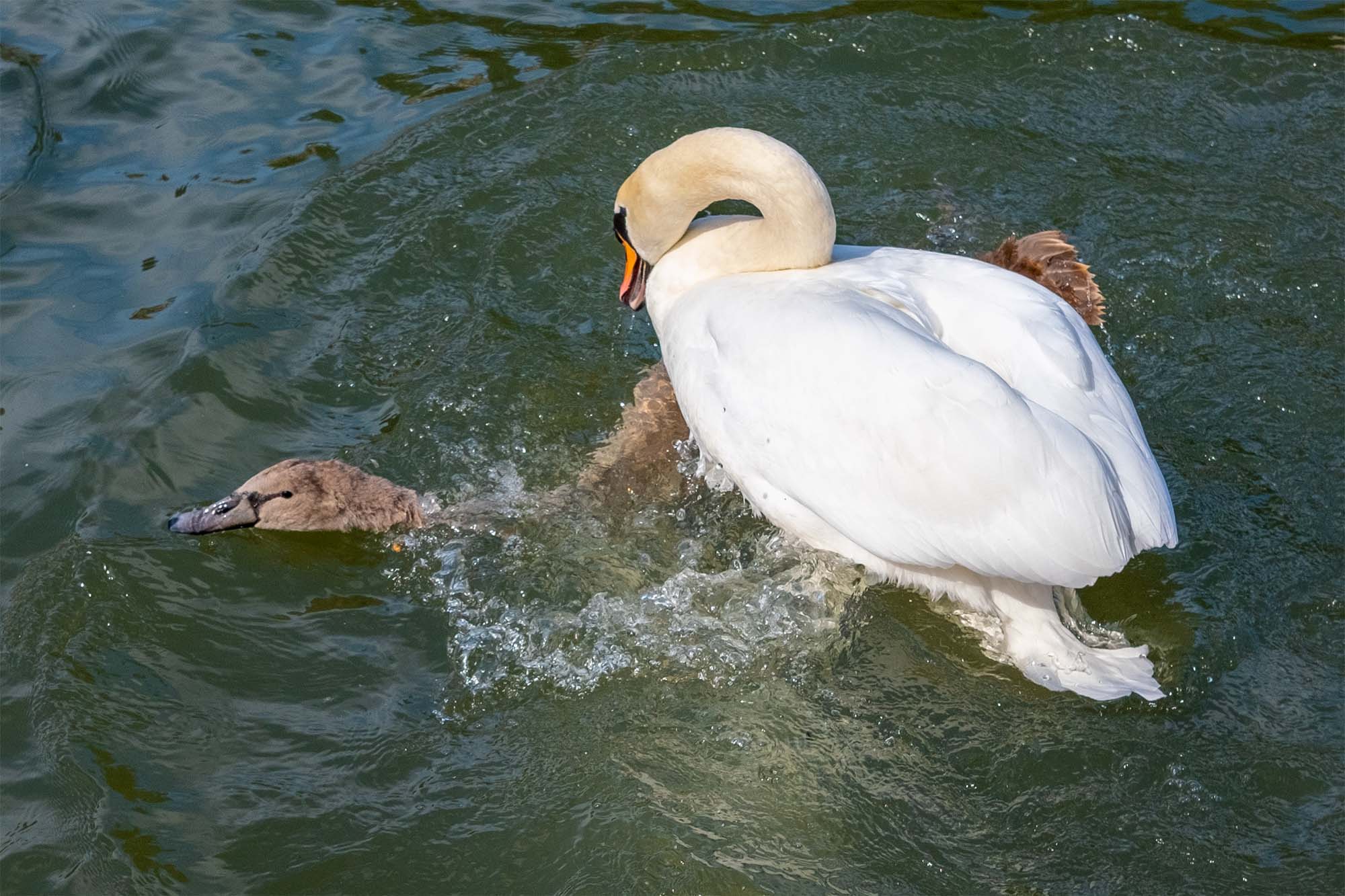 The adult swan harassed this poor juvenile up and down the river. It pecked it and bit it and drove it under water. And it would not let go. We on the bank called to it to distract it; a young boy threw bread to attract its attention, and nothing worked.