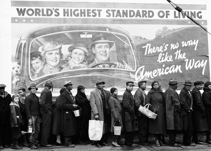 That wasn’t the limit of her vision, though. She photographed inside the death camps when they were liberated. She photographed Gandhi and Stalin. She photographed from the outside of the Chrysler Building in New York, sitting on one of the stylised eagles that decorate the top of the building. And she photographed the contrast between dream and reality and the racial divide in the USA. Witness this photo.