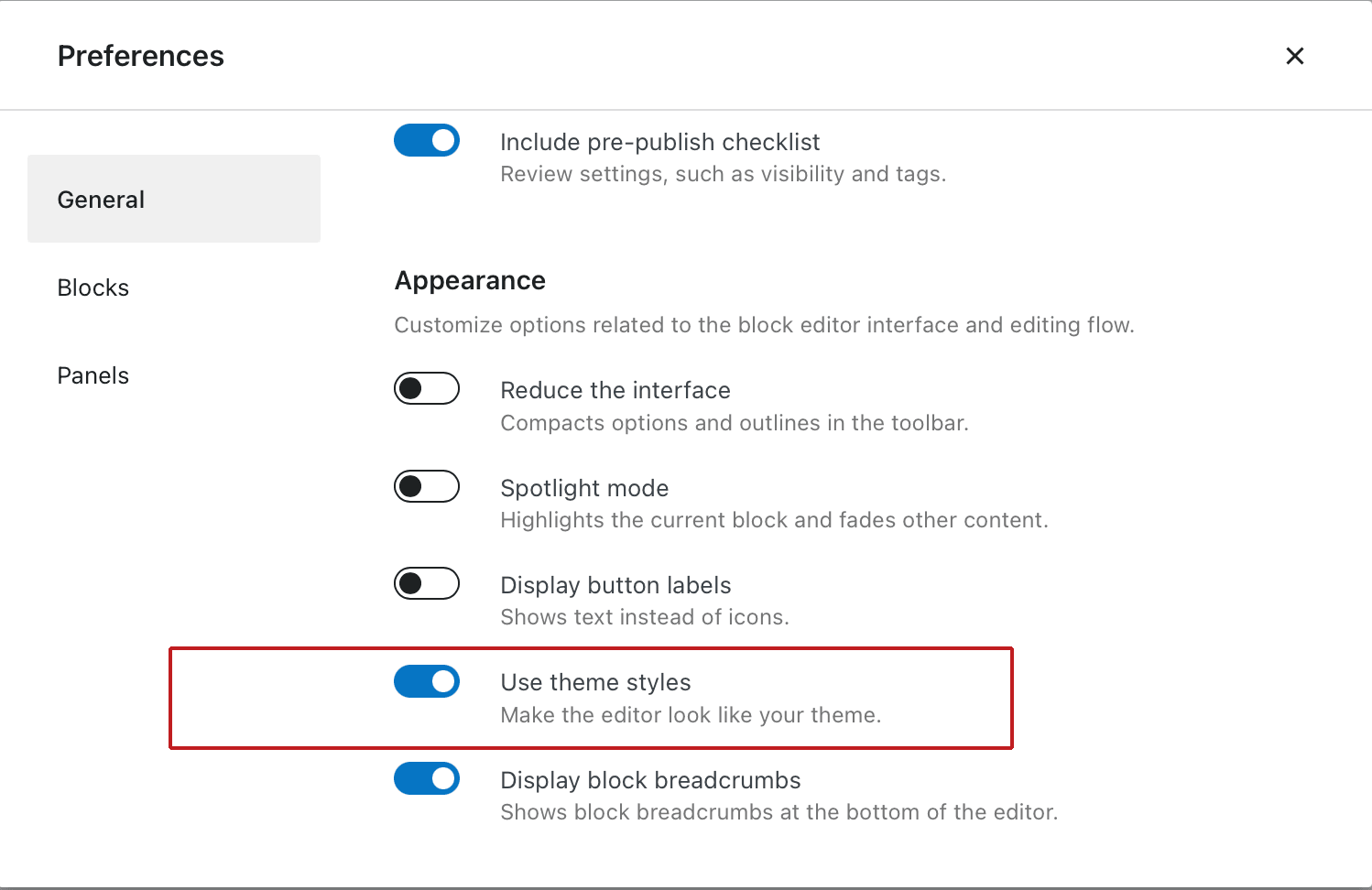 In the Admin panel click the three vertical dots at top right. A list will open up, and right at the bottom you will see ‘Preferences’. Click that and this panel will open up in the middle of your screen.