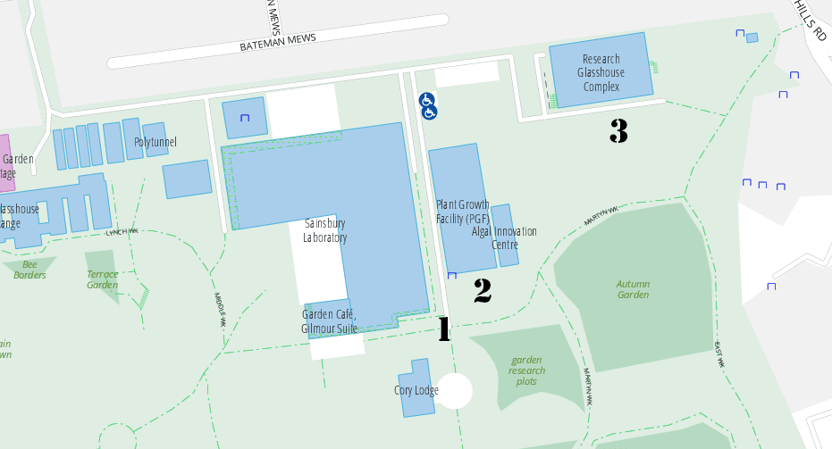 Cambridge University Botanic Garden is more than a garden. It also houses plant science departments. And in response to Deb, who asked what the buildings are that appeared incidentally in the post about the fox at the garden, here are the buildings and a key to what they are.