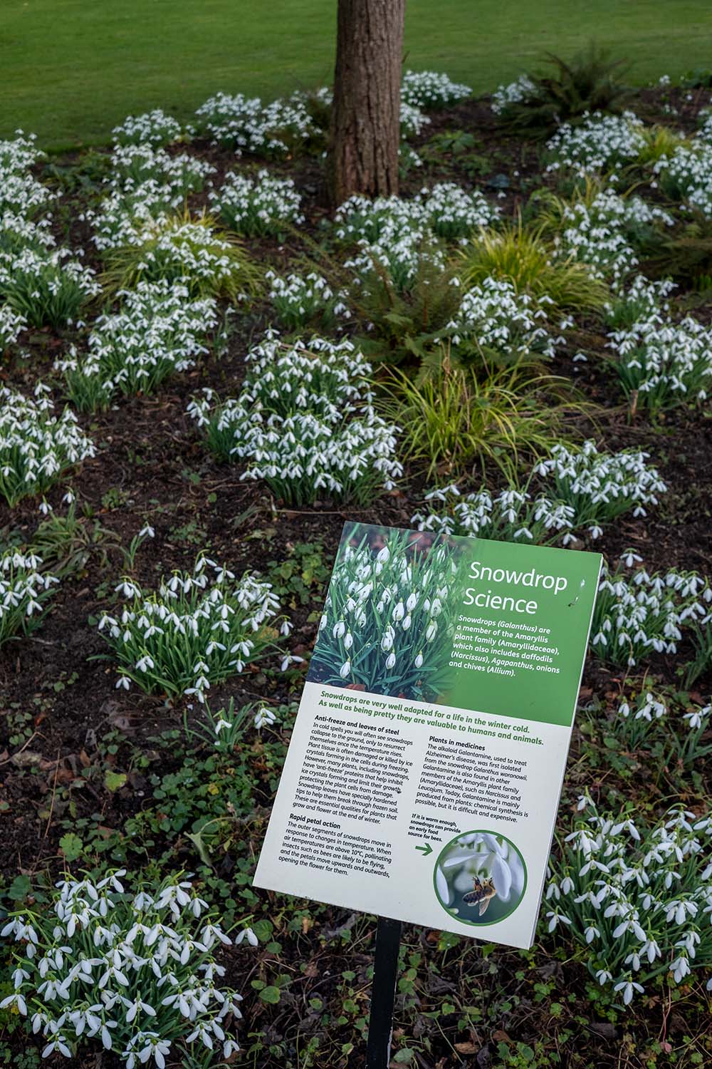 Around a couple of the beds – and there are thousands of snowdrops in bloom at the Botanic Garden at the moment – are explanations and stories about snowdrops. One notice mentions that the stories are taken from A Monograph of Cultivated Galanthus (published by Bishop, Davis & Grimshaw in 2001). And the rest of this post is taken from highlights in the display notices, including how snowdrops beat icy weather.