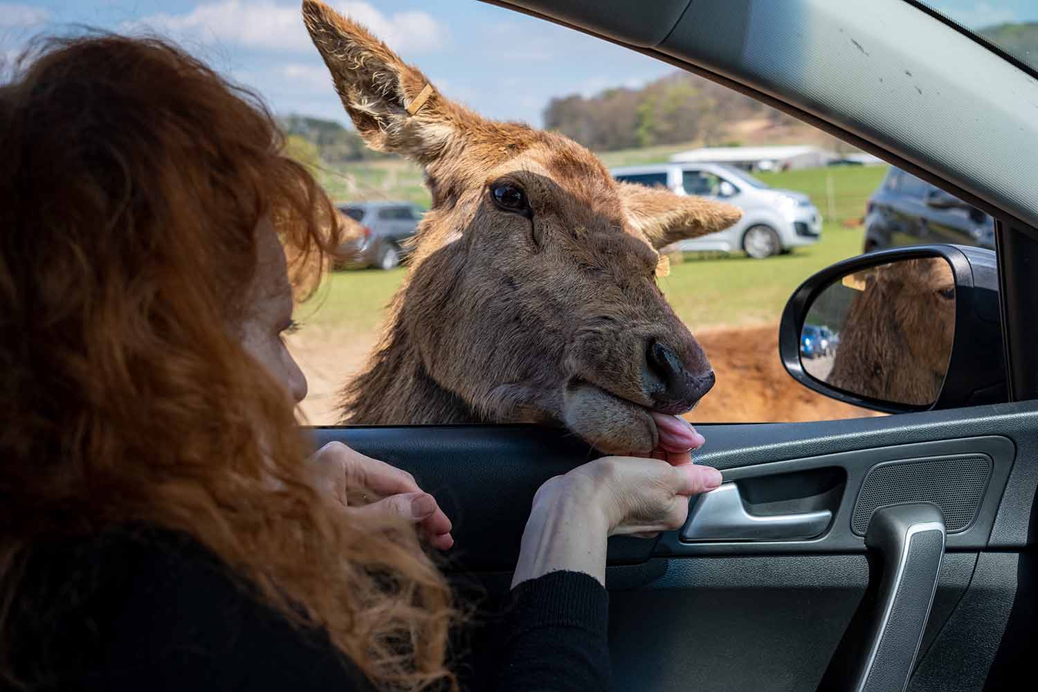 The Red deer at Longleat Safari Park in the south-west of England are not tame. They are wild animals, it is just that they know that the visitors come with food. The visitors buy cups of pellets at the little stand, and park on the grass. The deer know that when a cupped hand comes out, they can eat. Once the pellets run out, the deer move away.