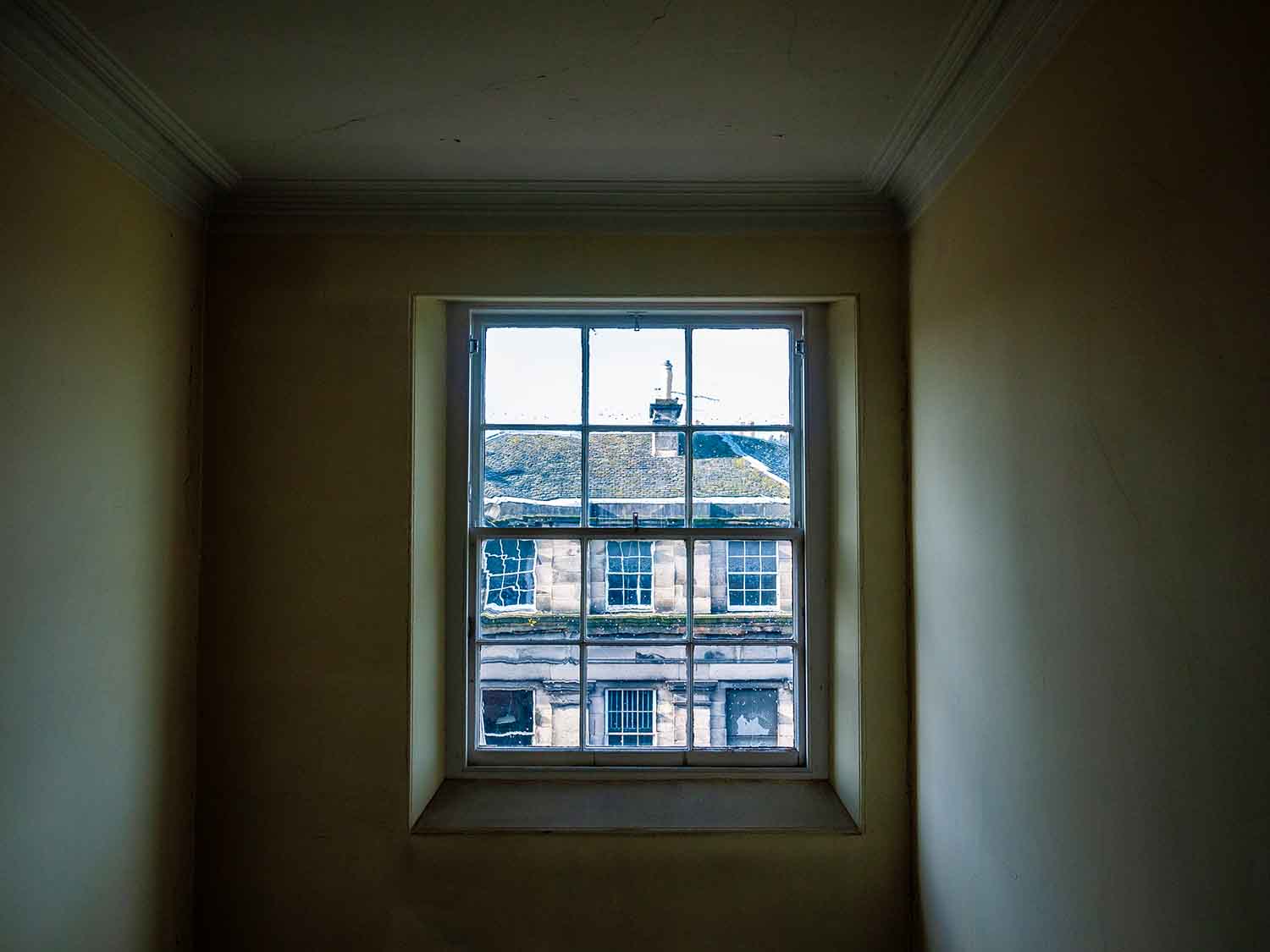 Sheet glass made by dropping a large blob of molten glass from a height was never flat in the same way that modern glass is. And it was softer. That’s what’s caused the distortion you can see in the view of the buildings across the street seen out of the window.