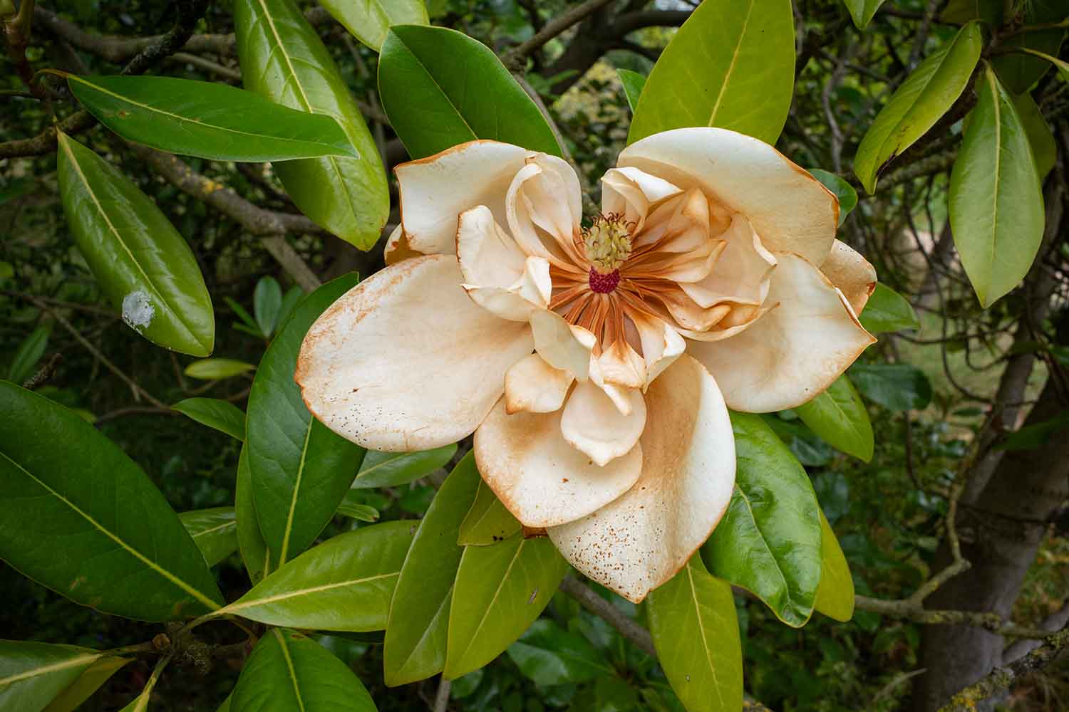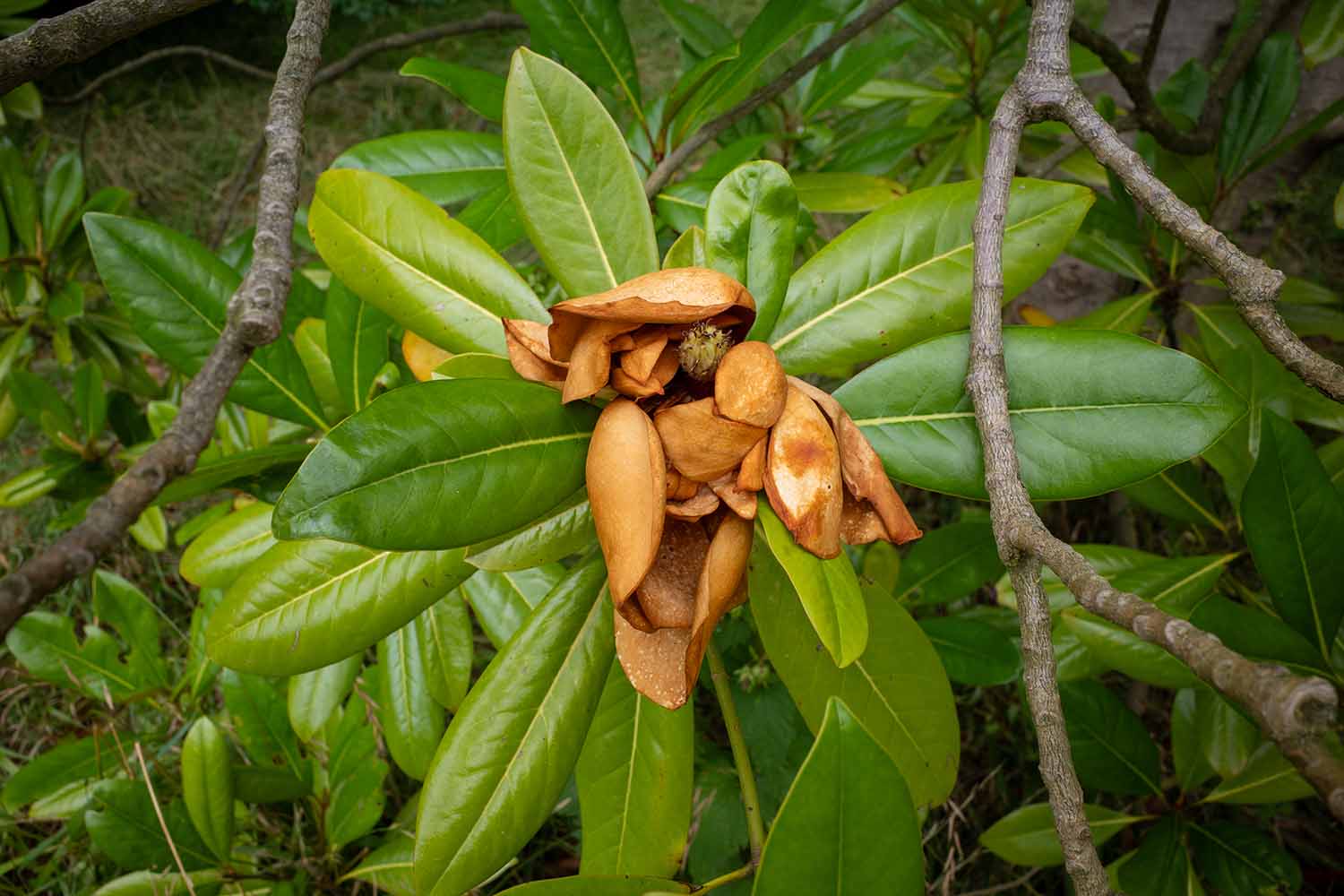 He pointed out that the grandiflora is an evergreen whereas the others are deciduous. That’s not an explanation in itself, but it does explain why there might be differences in the flowering season between it and all the other magnolias in the botanic garden.