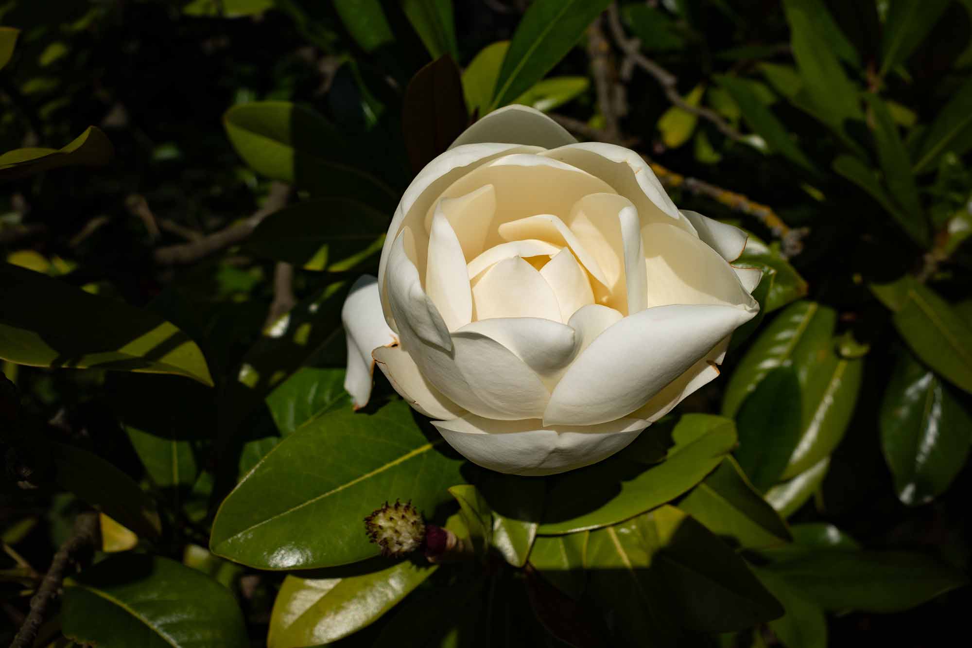 As I have written before, the flowers on this tree are big compared to most others that we see in the UK at about 12cm ( 4 3/4 inches). Magnolia Grandiflora is native to the South-Western United States, so it is used to a warmer climate and flowers in Spring there. Here we are in Cambridge in the UK at 52• N and it is flowering in August.