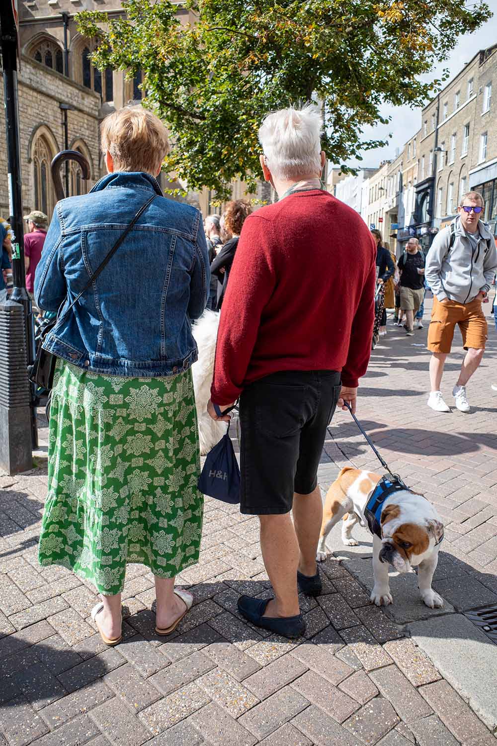 The bulldog stares with what appears to be displeasure at the world around it. Meanwhile the humans look out at what attracts their attention, with the two of them in one world and the dog in another.