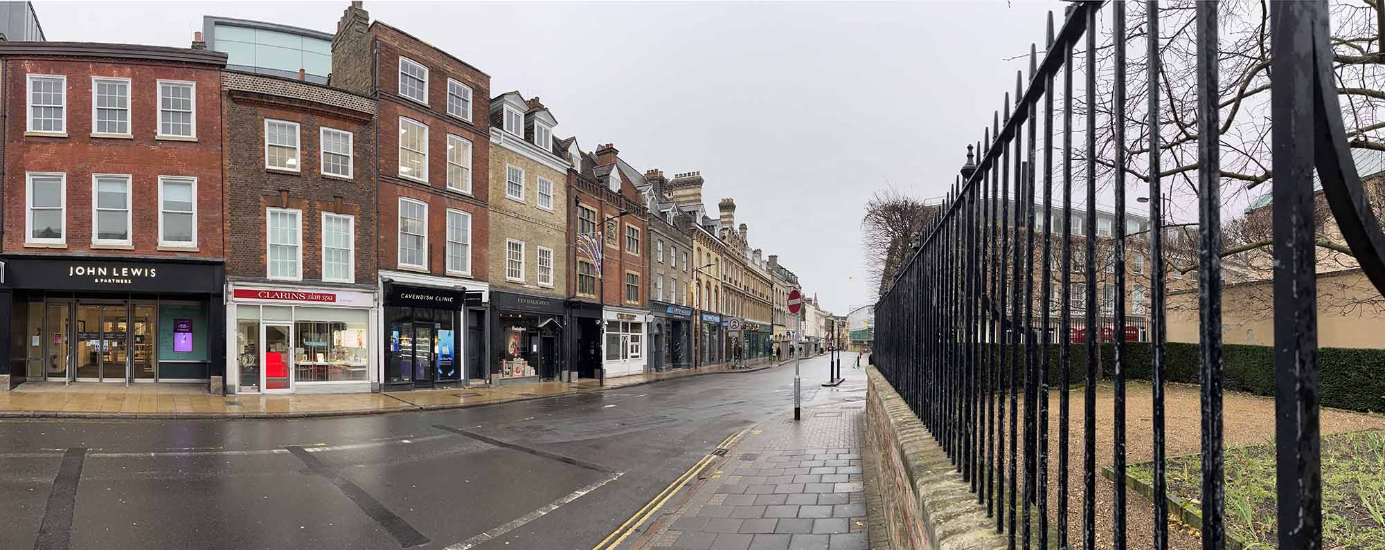 It’s not often that St Andrew’s Street is this quiet. The railing to the right of the scene is the frontage to Emmanuel College. The street continues down and becomes Sidney Street and then Bridge Street.