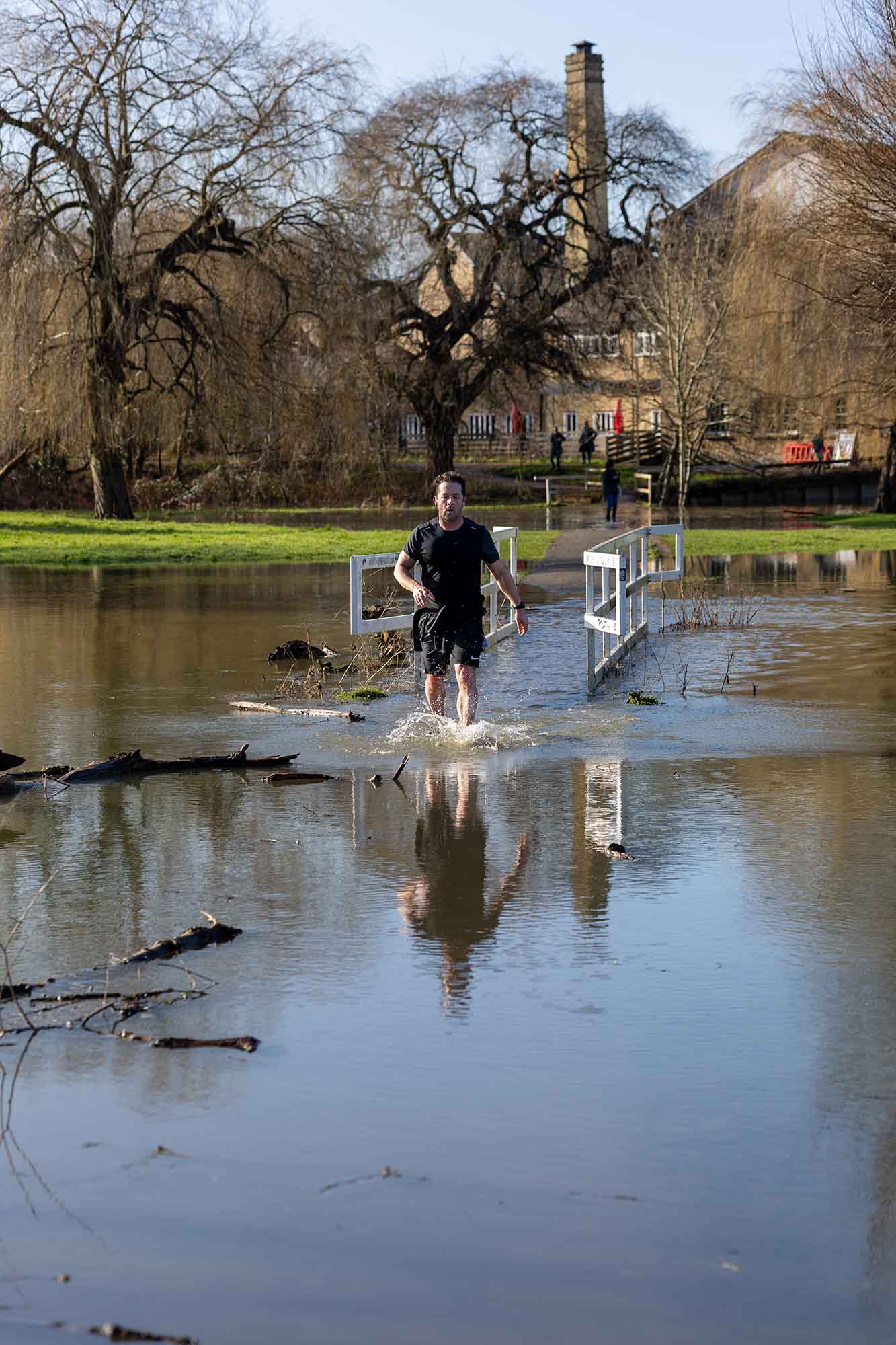 Runner showing that water is no obstacle across Sheeps Green in Cambridge, which is normally a field – after rain that flooded and broke the banks of the River Ouse.
