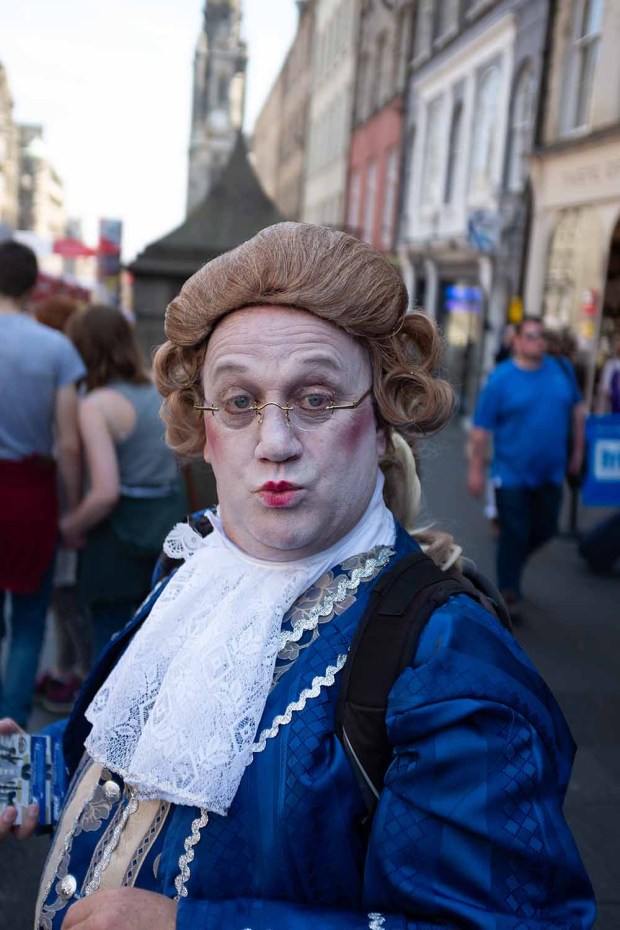 Shot with a Fuji X100S in 2015 on the Royal Mile in Edinburgh, the man is a performer from one of the Fringe shows acting in keeping with his character..
