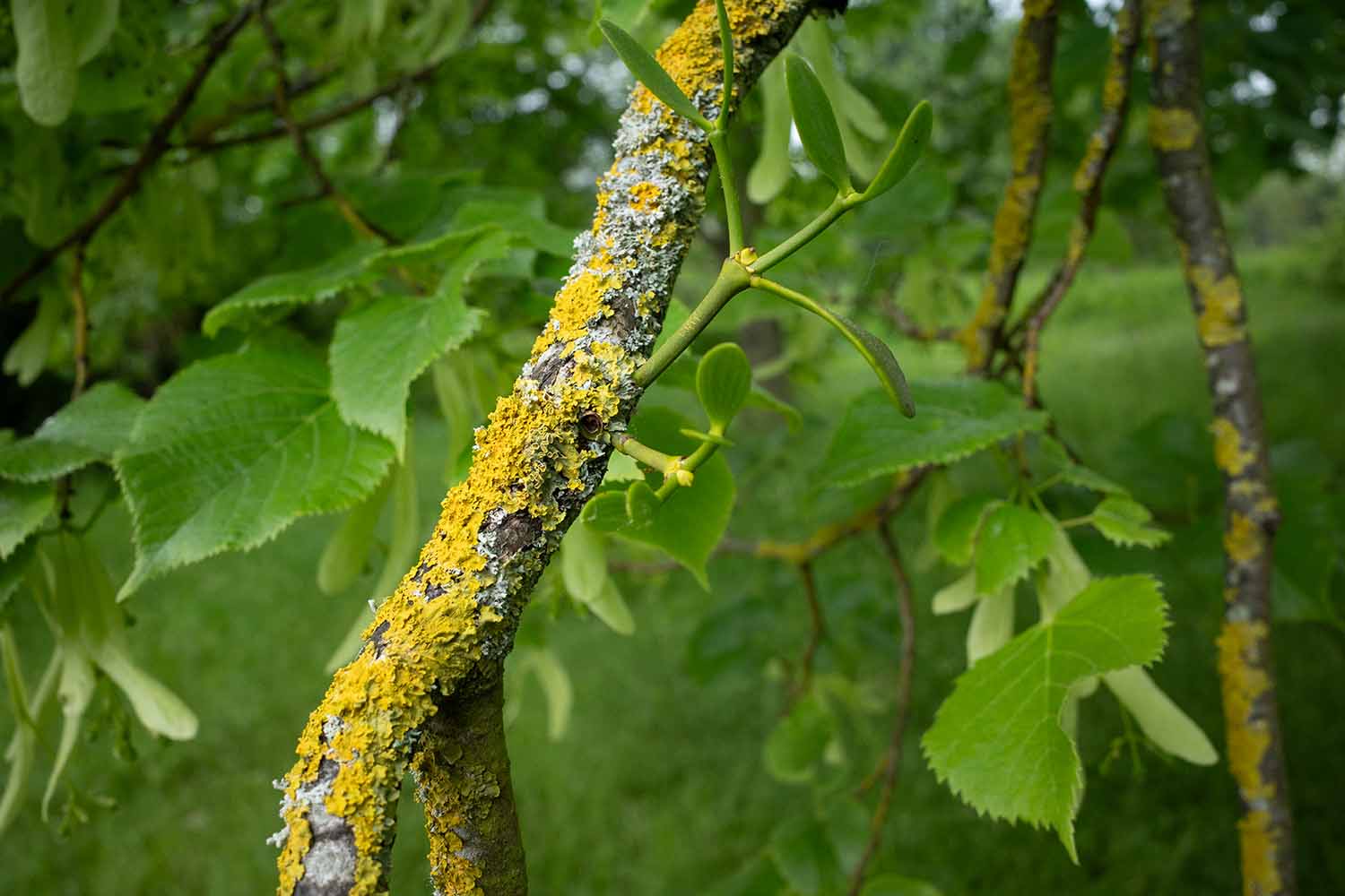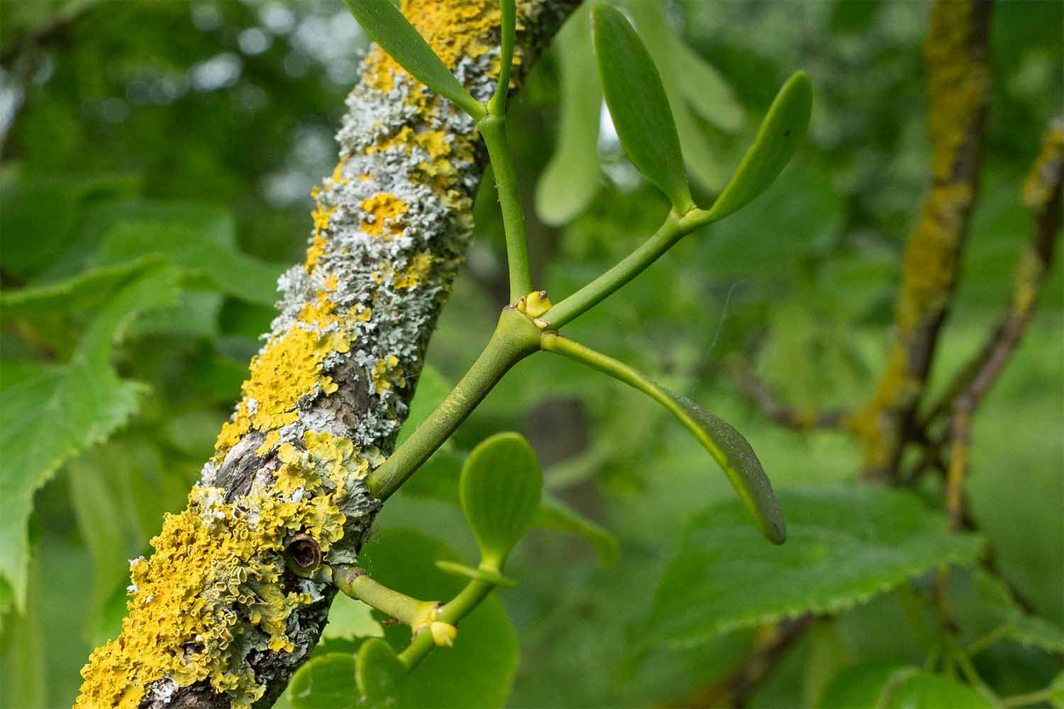 Mistletoe (Viscum album) is an evergreen plant that with white berries in winter. It is a parasitic plant that lives off the nutrients and water from a host tree. And although it is parasitic, it will generally not kill the host tree but it can weaken it.