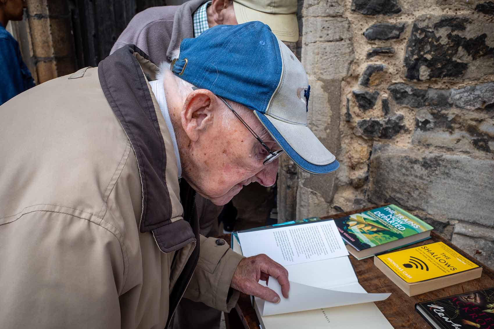 This is outside St Botolph’s church in the city centre here in Cambridge. The church was holding a book sale and the man in the blue hat was showing his friend this book. He has such a lovely look of concentration on his face.