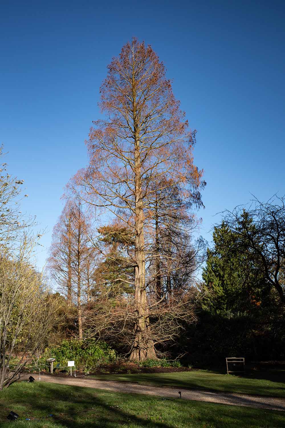 The Dawn Redwood (Metasequoia glyptostroboides) is deciduous. The one in the Cambridge University Botanic Garden is around twenty-five metres (80 feet) tall.