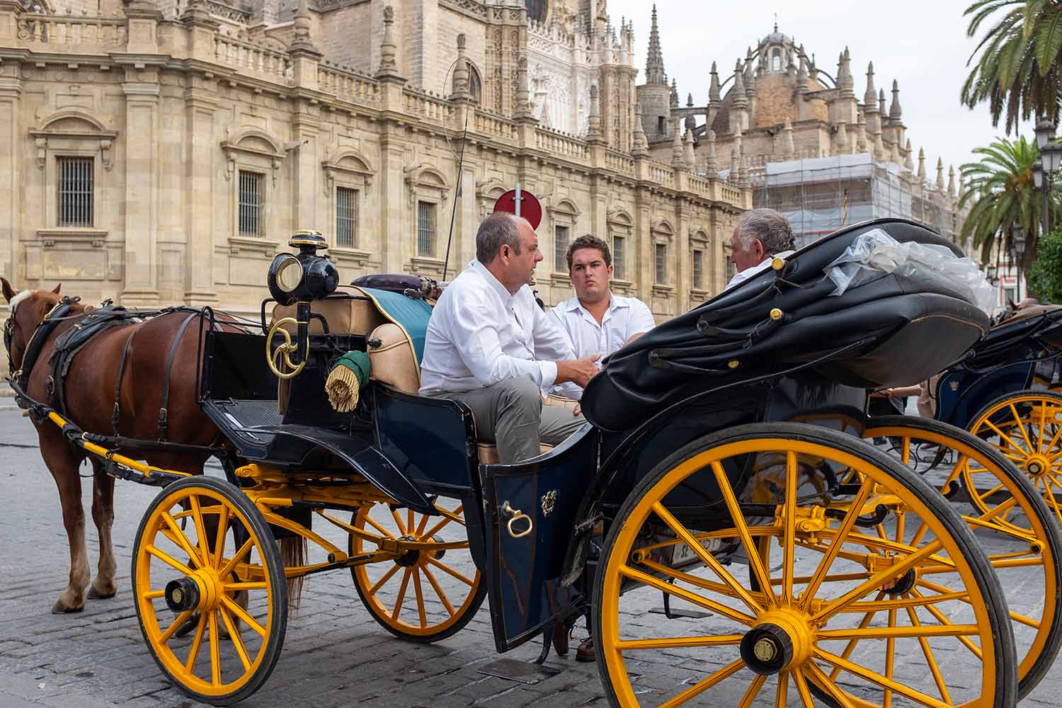 The photo is of three coachmen resting between rides in a horse-drawn carriage in Seville. I like the way the man talking is indicating with his right hand, relaxed with people with whom he is comfortable.