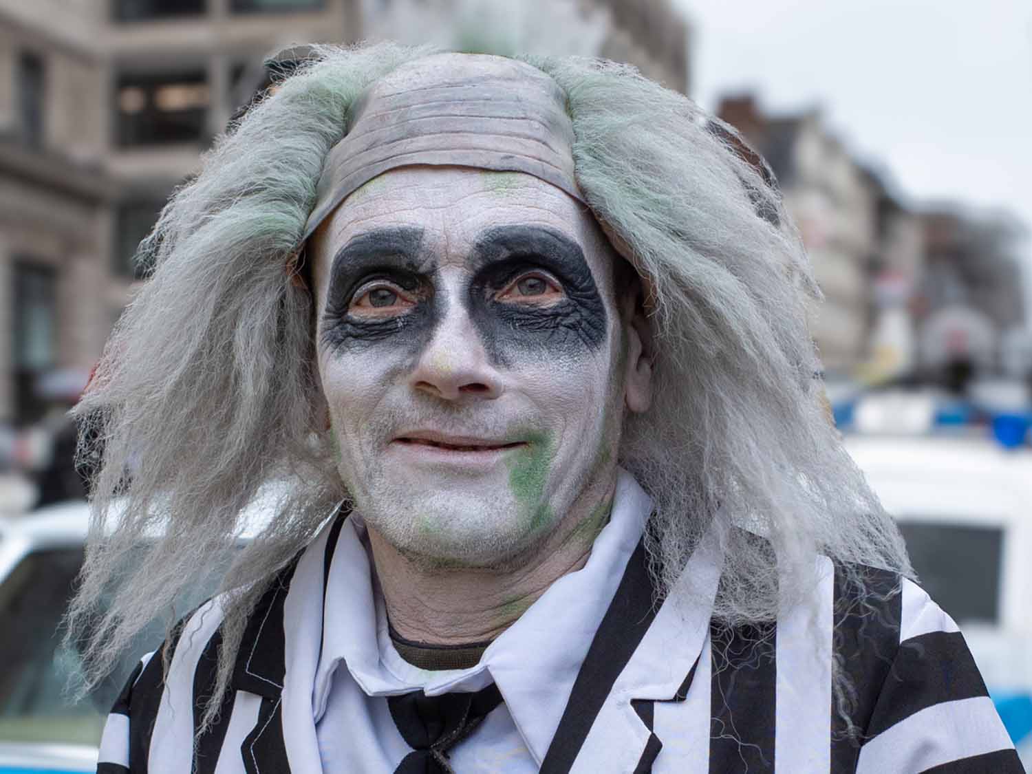 The two women seemed to know where to look, but not so with a man in a Beetlejuice costume I saw twice that day. The first time was in Starbucks where I met a group from the University of West Kentucky. They came – 350 of them – and all tuba players. So you can estimate how many people overall there were at the parade.
