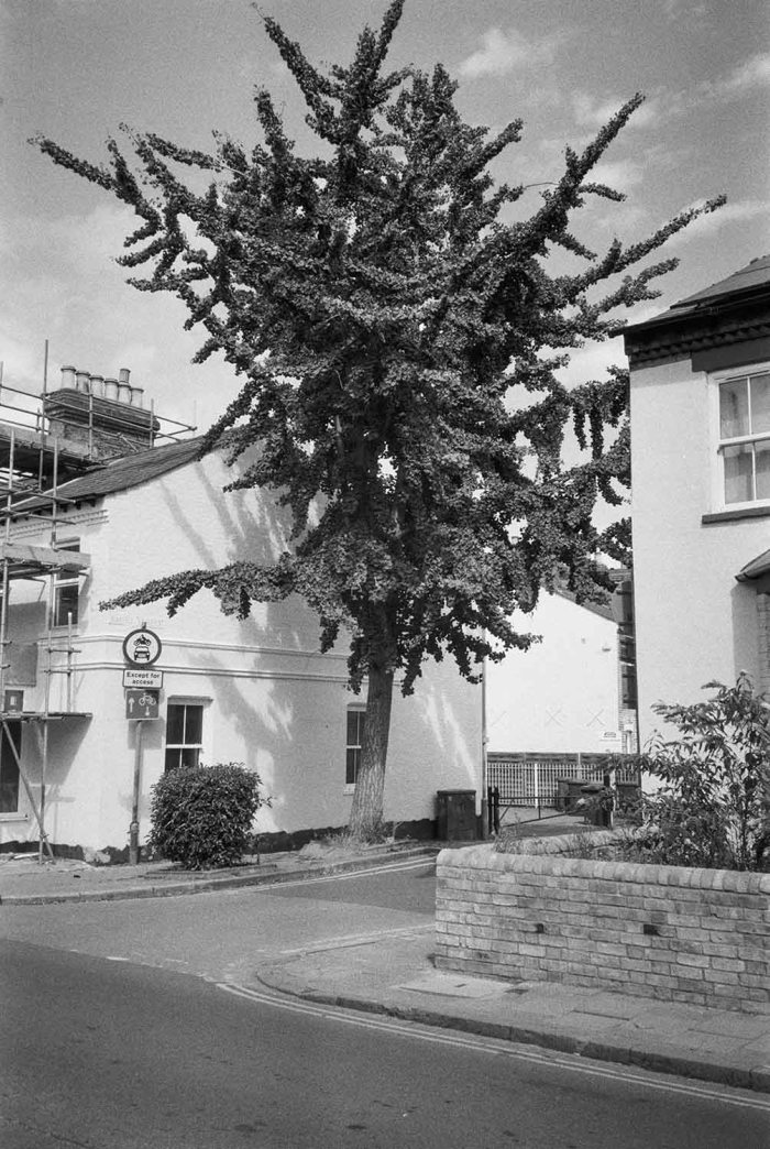 The tree is a Ginkgo biloba growing on Mill Road in Cambridge, looking like it has outgrown its surroundings.