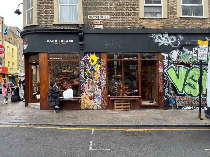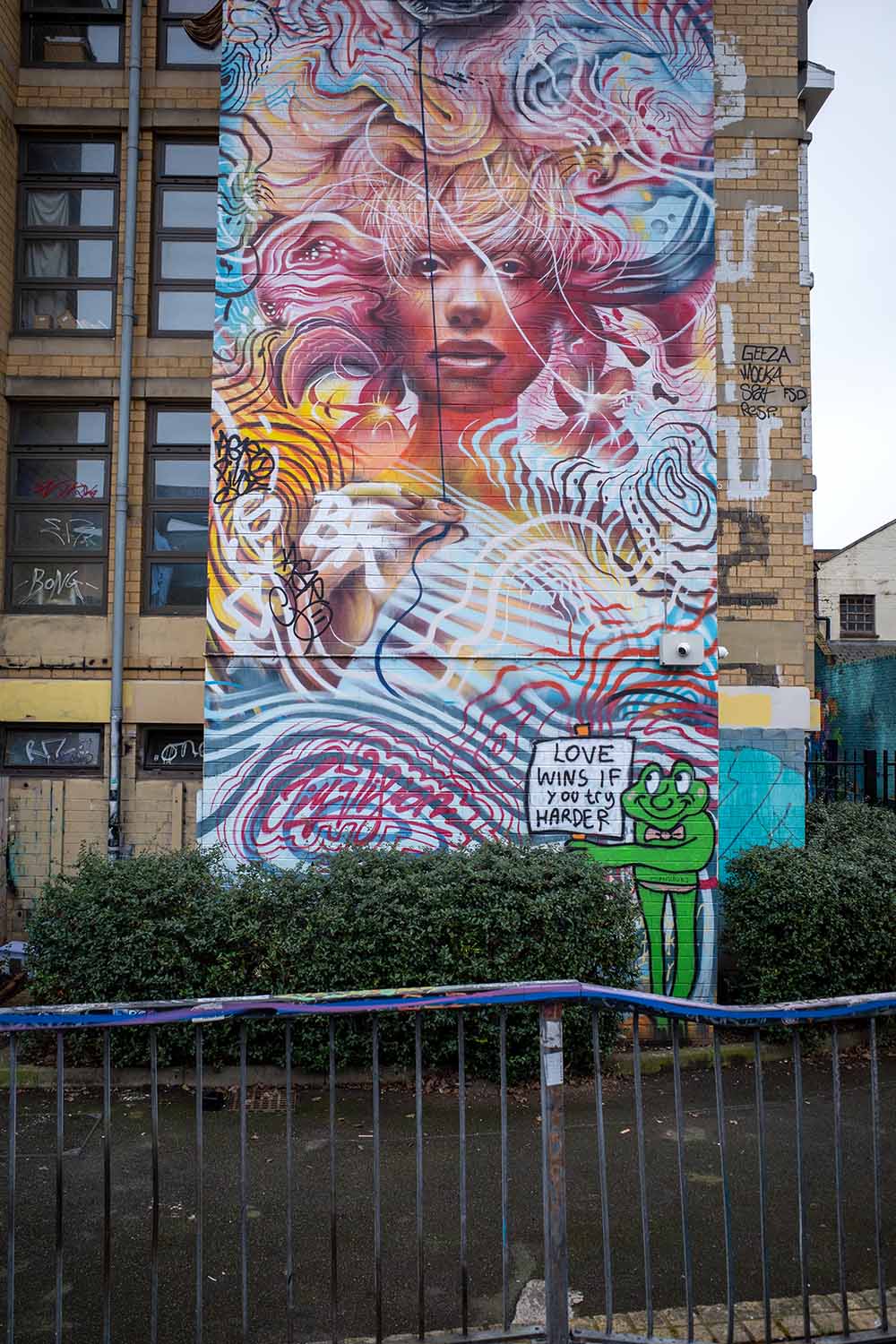 I don’t like graffiti. I don’t like it when it is done furtively, a quick and ugly tag on a trash bin or a wall. That graffiti is mealy mouthed and weak. Here in Brick Lane in London the graffiti surely did not appear furtively; it IS the environment. Brick Lane is wild and untamed. Brick Lane is run by the people.