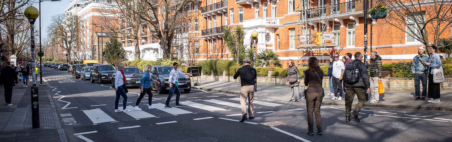 Meanwhile, up the road half a mile away on Abbey Road, people imitate the Beatles crossing the road. The traffic has to wait because people are blocking the road while they play out the scene from the album cover. Ah well, it is only for a few moments.