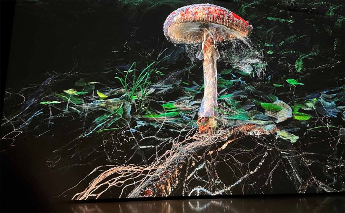 This is a photo of a photo of an Amanita muscaria, a mushroom commonly known as a Fly agaric. It is from the exhibition Soil: The World At Our Feet at Somerset House in London.