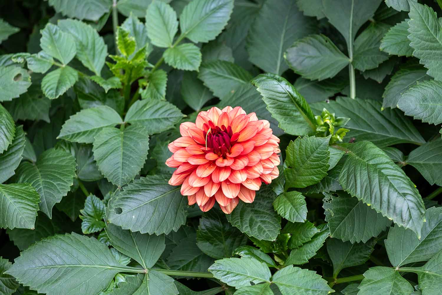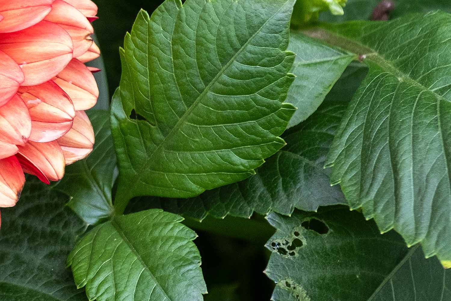 Now, is it a dahlia or a chrysanthemum? Chrysanthemum leaves are duller, thinner and moredelicate, and the leaves are divided into several rounded lobes.