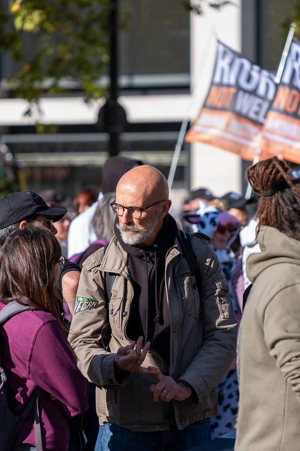 At the animal rights protest, this man stood out because he was tall, and for his features and his glasses.