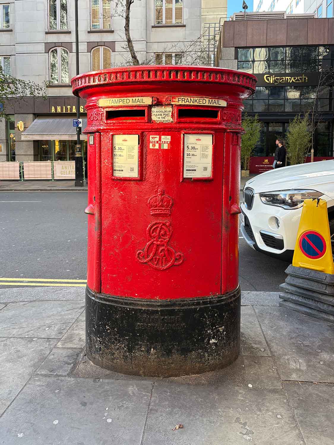 This one in upper Saint Martin’s Lane in London is a relatively rare King Edward VII postbox. It’s rare because King Edward VII only reigned for 10 years and they’re only about 200 such boxes in the UK.