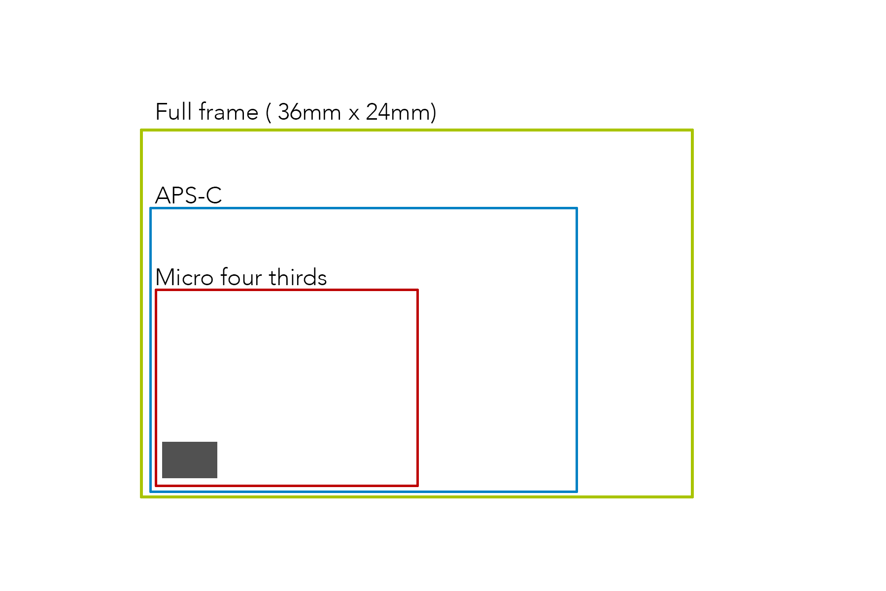 Here is a diagram showing the size of the sensor compared to Micro four-thirds, APS-C, and full-frame sensors. As you can see, the sensor – the little dark rectangle – is tiny.