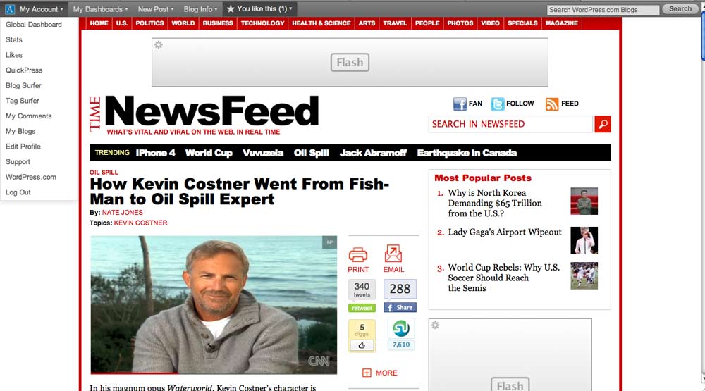 I was reading an article in Time magazine entitled ‘How Kevin Costner Went From Fish-Man to Oil Spill Expert’