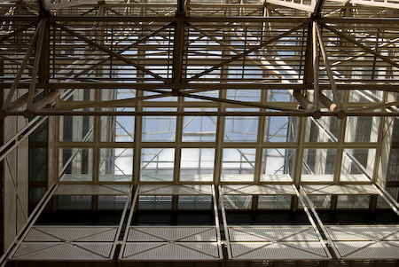 Looking up at a rare glimpse of sun in one of the walkways by the shops at Liverpool Street Station.
